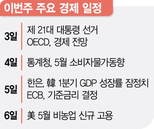 이번 주에는 3일 대통령 선거 후 차기 대통령이 경제정책과 관련해 어떤 일성을 내놓을지 주목된다. 한국은행이 올해 우리나라 경제성장률 전망치를 0%대로 낮춘 만큼 새 정부는 집권 초기부터 경기 부양에 적극적으로 나설 가능성이 크다. 이재명 더불어민주당 대선 후보와 김문수 국민의힘 대선 후보 모두 35조 원대 추가경정예산을 예고해 누가 당선되든 추경 편성이 본격화할 것으로 보인다. 대통령이 취임식에서 추경의 구체적 규모와 방향을 언급할지도 관심사다.