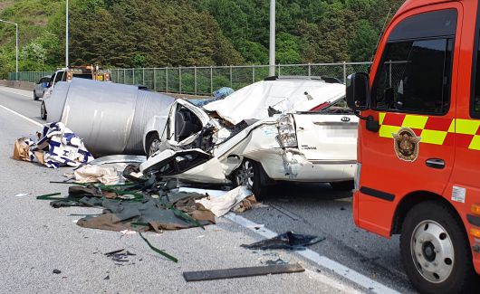 지난달 27일 07시 37분께 경부고속도로(서울 방향) 천안분기점 인근에서 25t 화물차가 4차로를 달리던 중 타이어가 갑자기 터지면서 중심을 잃고 갓길의 시설물과 충돌했다.