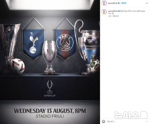 [서울=뉴시스] 유럽축구연맹(UEFA) 슈퍼컵에서 격돌하게 된 UEFA 챔피언스리그(UCL) 우승팀 파리 생제르맹(프랑스)과 UEFA 유로파리그(UEL) 챔피언 토트넘홋스퍼(잉글랜드). (사진=토트넘홋스퍼 SNS 캡처) *재판매 및 DB 금지 |