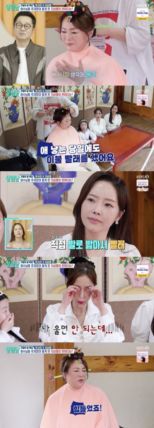 지상렬의 형수는 많은 식구를 돌보며 너무나도 바쁜 하루하루를 살았다고 고백하며 눈시울을 붉혔다. 애 낳는 당일에도 이불 빨래를 했다는 형수. 직접 발로 밟아서 빨았다고. 형수는 “그 순간에도 세제가 너무 아까웠다. 안 빨아도 되는 것도 빨고”라고 설명했다.