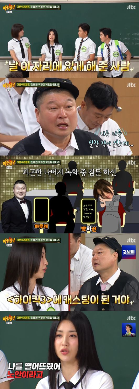 박하선은 "옛날 '강심장'은 (촬영을) 오래 찍었다. 내가 너무 피곤해서 촬영 중 졸았는데, 그걸 (캐릭터로) 살려줬다. 덕분에 '하이킥3'에 캐스팅됐다. 사실 '하이킥2' 신세경 씨 역에서 노안이라고 떨어졌었다. 감독님이 '강심장'을 보고 '쟤 재밌는 애네, 다시 데리고 와' 라고 했다. 덕분에 집도 사고 차도 샀다. 너무 고마웠다"라고 밝혔다.