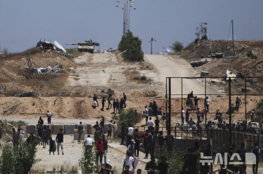 [칸유니스=AP/뉴시스]5월 29일 가자지구 남부 칸유니스에 있는 '가자 인도주의 재단'(GHS) 배급소 인근에 이스라엘군 전차들이 배치돼 있다. 2025.06.01. |