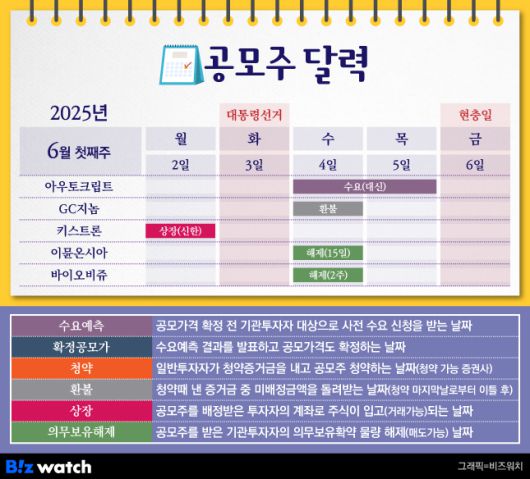 6월 첫째 주 공모주 일정을 알아볼까요. 이번 주에는 대통령선거(6월 3일)와 현충일(6월 6일)로 장이 이틀 쉬어가요.