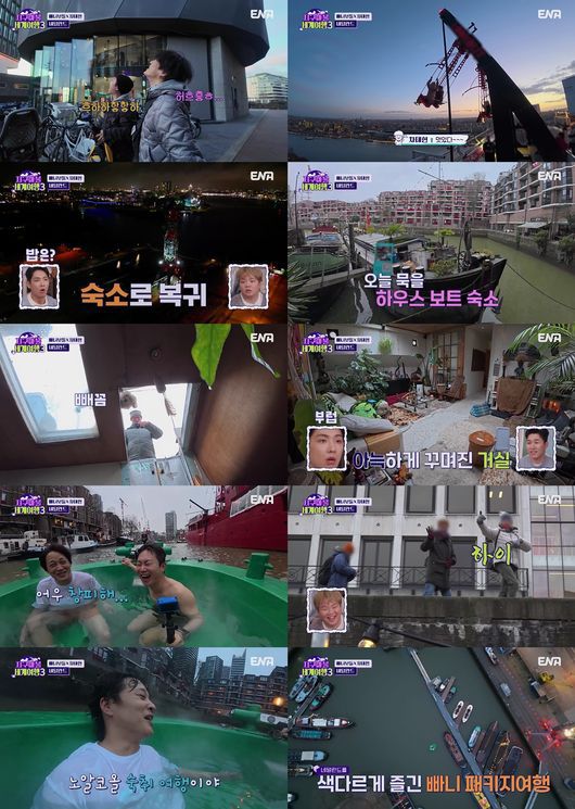 가장 먼저 빠니보틀과 차태현이 네덜란드의 아찔한 일몰 체험으로 시선을 사로잡았다. ‘평범함을 거부한다’는 빠니 패키지팀 답게 평범한 일몰 대신, 100m 상공에 있는 공중 그네를 타고 일몰을 즐긴 것. 이튿날 크레인 호텔에서 체크아웃한 뒤엔 유럽 최대 항구 도시 로테르담으로 이동해 물 위에 떠 있는 하우스 보트 숙소에 체크인했다.