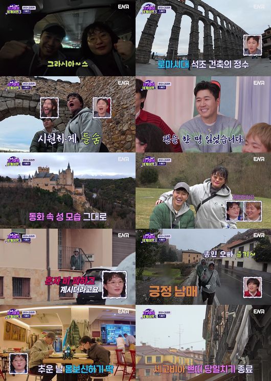 [OSEN=최이정 기자] 지난 31일 방송된 ENA ‘지구마불 세계여행3’(이하 ‘지구마불3’) 11회에서는 4라운드의 3번째 여행기가 전개됐다. ‘7박 8일’ 팀 빠니보틀과 차태현은 네덜란드 아찔한 공중 그네부터 욕조 온천 보트까지, 하늘과 운하를 모두 섭력하는 극강의 도파민 액티비티를 경험했다. ‘마지막 찬스’ 팀 원지와 김종민은 스페인 세고비아에서 감성과 현실을 오가는 성덕 여행을 이어갔고, ‘브루맨스’ 팀 곽튜브와 이준은 야간 열차를 타고 헝가리로 이동, 다시 한번 이색 문화 체험에 흠뻑 빠졌다. 특히 곽튜브와 이준이 헝가리의 ‘돼지 귀 요리’을 먹는 장면은 시청률 최고 2.9%까지 상승했고, 두 사람은 또 한 번 최고의 1분 주인공이 됐다(닐슨코리아 제공).