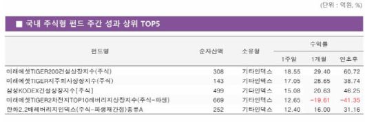 1일 펀드평가사 KG제로인에 따르면 순자산액(클래스 합산) 100억원 이상, 운용 기간 1개월 이상인 국내 주식형 펀드의 최근 일주일(5월 23~30일) 수익률을 분석한 결과 한 주간 가장 높은 수익률을 기록한 ETF는 미래에셋자산운용의 ‘TIGER 200 건설’ ETF로 한 주간 18.55% 상승했다. 3위는 ‘KODEX 건설’ ETF로 15.08%의 상승률을 보였다.