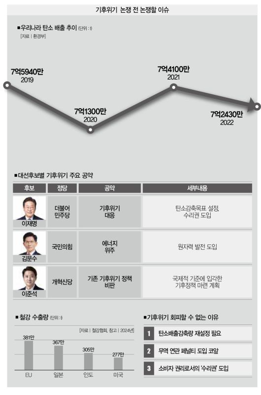 환경 문제가 중요하지 않다고 말하는 정치인은 드물다. 하지만 21대 대선에선 유독 기후공약이 눈길을 끌지 못했다. 주요 후보 중 기후위기를 다룬 공약을 낸 이가 거의 없었기 때문이다. 하지만 기후위기는 허투루 다룰 만한 이슈가 아니다. 세계시장뿐만 아니라 우리의 작은 일상과도 맞닿아있기 때문이다. 기후위기 공약이 있든 없든 논쟁해야 할 이슈가 많다는 거다.