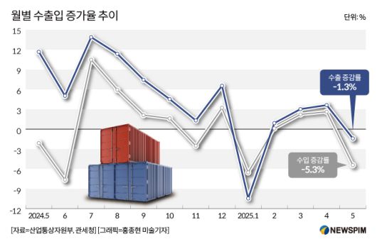 1일 산업통상자원부가 발표한 '5월 수출입 동향'에 따르면, 지난달 수출은 572억2000만달러로 전년 동월 대비 1.3% 감소했다. 이는 1월(-10.1%) 이후 4개월 만에 감소세로 전환한 것이다.