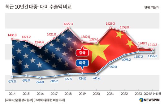 대중국 수출은 최대 수출 품목인 반도체와 석유화학 수출이 감소하면서 전체적으로 8.4% 줄어든 104억달러를 기록했다.