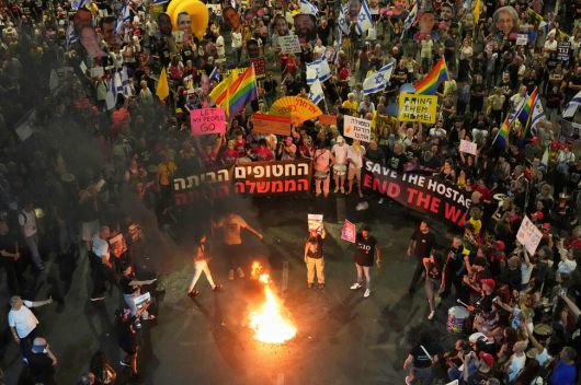 31일 이스라엘 텔아비브에서 가자 전쟁 종식을 요구하는 시위에 시민들이 대거 참여하고 있다. AP 연합뉴스 |
