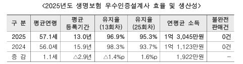 손해보험업계에서는 전체 대상의 12%인 1만 5960명이 우수인증설계사로 선정됐다. 13회차 평균 유지율은 95.4%, 25회차는 92.2%로 높았다. 연 평균 소득은 1억 1705만원으로 집계됐다.