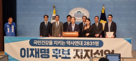 김대업 전 대한약사회 회장과 각 지역약사회 회장이 지난달 28일 국회 소통관에서 기자회견을 열고 이 재명 후보에 대한 지지 의사를 밝혔다.(사진=안치영 기자) |