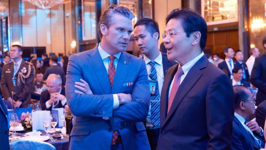 ▲ 피트 헤그세스 미국 국방장관과 로렌스 웡 싱가포르 총리가 30일(현지시간) 싱가포르 샹그릴라호텔에서 열린 아시아안보회의에서 대화를 나누고 있다.