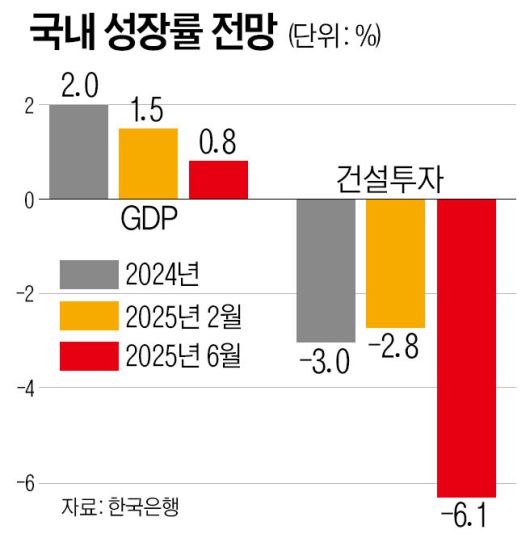 이처럼 부진한 건설경기는 전체 한국 경제에도 큰 부담을 주고 있다. 건설업은 국내총생산(GDP)의 15%를 차지하는 국가 경제의 근간이다. 한은의 올해 성장률 전망치는 2월 1.5%에서 0.8%로 불과 석 달 새 0.7%포인트(p)나 낮아졌는데, 하락 폭(0.7%p) 가운데 절반이 넘는 0.4%p가 건설투자 침체 때문이라는 게 한은 측 설명이다.