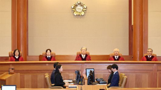 ▲ 김형두 헌법재판소장 권한대행과 재판관들이 29일 서울 종로구 헌법재판소 대심판정에서 '아청법 전과자 택시기사 자격 취소' 헌법소원 심판 선고를 위해 입장한 뒤 착석해 있다.
