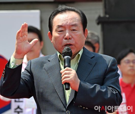 아시아투데이 송의주 기자 = 이인제 국민의힘 상임고문이 1일 경기 성남시 분당구 관보빌딩 앞 광장에서 열린 김문수 국민의힘 대선 후보의 유세에서 시민들에게 지지를 호소하고 있다. ⓒ "젊은 파워, 모바일 넘버원 아시아투데이"