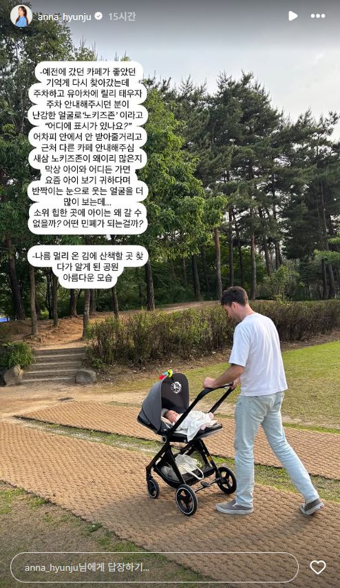 임현주 아나운서는 1일 자신의 인스타그램 스토리에 "예전에 갔던 카페가 좋았던 기억에 다시 찾아갔는데 주차하고 유아차에 릴리 태우자 주차 안내해주시던 분이 난감한 얼굴로 '노키즈존'이라고. "어디에 표시가 있나요?" 어차피 안에서 안 받아줄거라고 근처 다른 카페 안내해주심. 새삼 노키즈존이 왜이리 많은지 막상 아이와 어디든 가면 요즘 아이 보기 귀하다며 반짝이는 눈으로 웃는 얼굴을 더 많이 보는데"라고 아쉬움을 드러냈다.