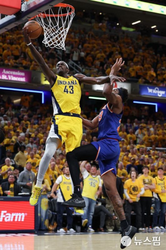[인디애나폴리스 로이터 =뉴스핌] 박상욱 기자 = 파스칼 시아캄이 1일 NBA 동부 콘퍼런스 결승 6차전 홈 경기 2쿼터 슛을 하고 있다. 2025.6.1 psoq1337@newspim.com |