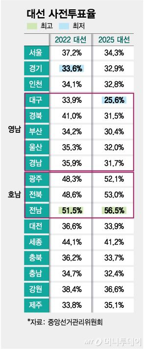 제21대 대선 사전투표에서 지난 대선에 비해 호남지역 투표율은 일제히 상승한 반면 영남지역 투표율은 하락한 것으로 나타났다.