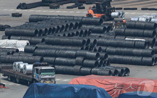 한국 철강업계가 도널드 트럼프 미국 대통령의 관세 상향 조치로 추가적인 실적 타격을 받게 됐다. 도널드 트럼프 미국 대통령은 외국산 철강에 대한 관세를 기존 25%에서 두배 올린 50%로 인상하는 조치가 오는 6월 4일 발효된다고 밝혔다. 사진은 1일 경기 평택시 포승읍 평택항 수출 야적장에 철강 제품이 쌓여있는 모습. 2025.6.1/뉴스1 ⓒ News1 김도우 기자 |