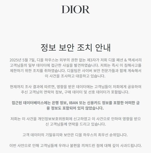 개인정보위에 따르면 디올은 지난 1월 유출 사고를 인지한 뒤 5월 10일 유출 사실을 신고했고, 티파니는 4월 사고 인지 후 5월 22일 신고했다. 두 브랜드는 루이비통모에헤네시(LVMH) 그룹 산하 기업이다.