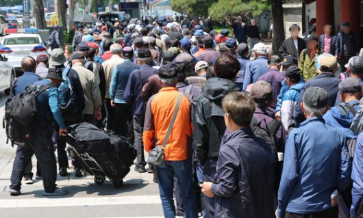 서울 종로구 탑골공원 무료급식소에서 어르신들이 줄을 서서 기다리고 있다. 뉴스1 |