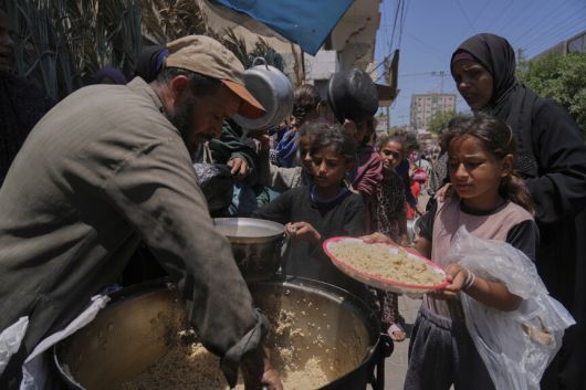 5월30일 가자지구 다이르알발라흐에 위치한 식량 배급소에서 팔레스타인 어린이들이 음식을 받고 있다. AP 연합뉴스 |