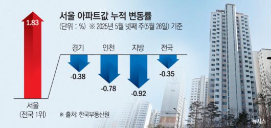 1일 한국부동산원 주간 아파트값 통계에 따르면 5월 넷째 주(5월26일 기준) 서울 아파트값은 올해 누적 1.83% 상승해 전국에서 가장 많이 올랐다. 반면 전국 아파트값은 -0.35%로 이미 지난해 누적 하락률 –0.74%의 절반에 달한다.