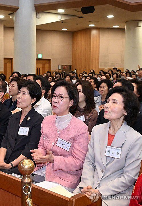 (서울=연합뉴스) 국민의힘 김문수 대선 후보 배우자인 설난영 여사(오른쪽)가 1일 서울 영등포구 여의도순복음교회에서 열린 주일 예배에 참석해 찬송가를 부르고 있다. 2025.6.1 [여의도순복음교회 제공. 재판매 및 DB 금지]