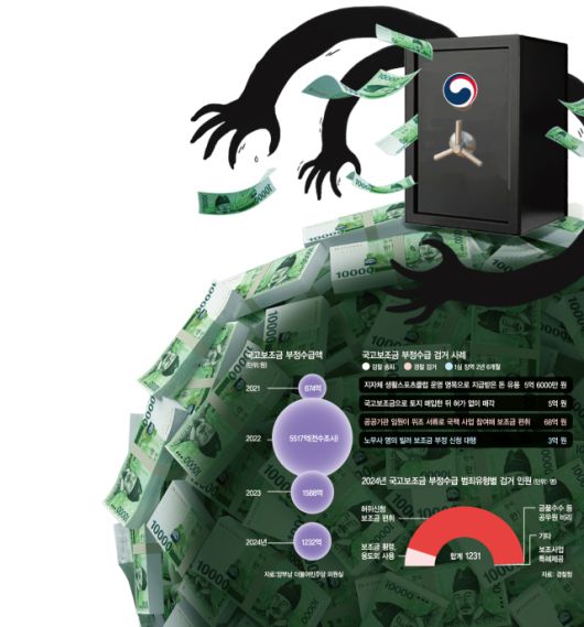 1일 서울경제신문 취재를 종합하면 지난해 기준 110조 원까지 불어난 국고보조금이 전국 곳곳에서 사기꾼들의 손에 의해 줄줄이 새고 있다. 지방자치단체 시설을 운영하는 명목으로 지급받은 돈을 유용하거나, 위조 서류로 국책 사업에 참여해 보조금을 편취하는 등 수법도 다양하다. 기획재정부와 경찰청 국가수사본부가 매년 국고보조금 부정 수급을 적발하기 위해 총력을 기울이고 있으나 부정 수급 과정에서 공무원들까지 직접 개입한 경우도 적잖아 적발이 쉽지 않은 것이 현실이다.