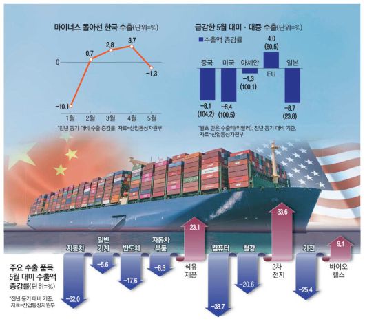 한국 양대 수출시장인 미국과 중국을 향한 한국의 수출이 지난달 나란히 8% 이상 급감했고, 품목별·국가별 관세 영향으로 자동차와 일반기계, 반도체 등 대미(對美) 주력 수출 품목은 수출액이 줄줄이 뒷걸음쳤다.