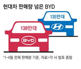 반면 올해 1~4월 현대차 신차 판매량은 국내 23만3870대, 해외 111만8018대로 총 135만1888대에 그쳐 BYD에 추월을 허용했다.
