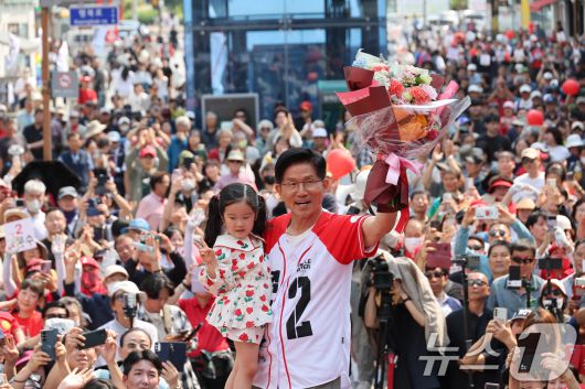 이날 오후 경기 남양주 다산신도시에서는 야구유니폼 안에 입은 '정직한 아빠, 깨끗한 대통령'이 적힌 흰색 티셔츠를 선보였다.