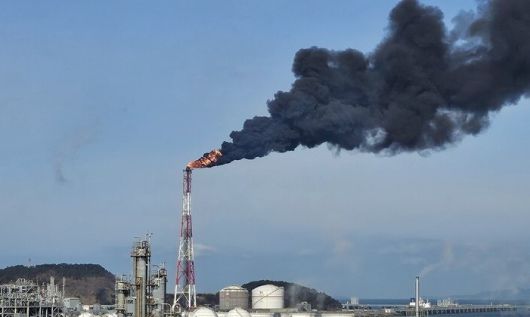 25일 오전 충남 서산 대산석유화학단지 내 LG화학과 롯데케미칼에 전기 공급이 끊기면서 공장 가동이 멈춘 가운데 생산공정에 투입된 원료를 태우는 작업이 진행되면서 굴뚝에서 검은 연기가 뿜어져 나오고 있다. 연합뉴스 |