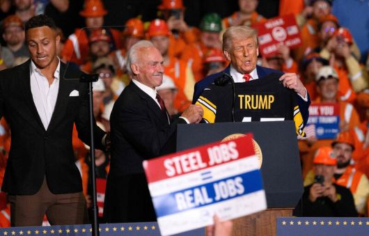 도널드 트럼프 미국 대통령이 30일(현지시각) 미국 펜실베이니아주에서 열린 ‘유에스스틸 어빈 워크스’ 집회에 참석한 모습. AFP연합뉴스 |