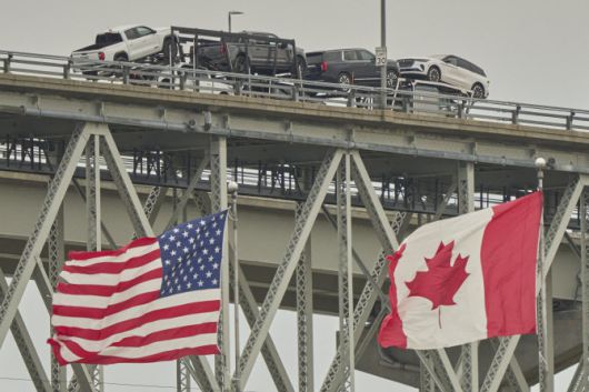 4월 3일, 캐나다 온타리오주 사니아에서 미국으로 향하는 블루워터 브리지 국경을 차량을 실은 트럭이 통과하고 있다. |