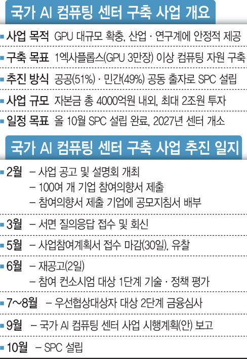 [이데일리 임유경 기자] 정부가 민·관 합작으로 2조원을 투입해 ‘AI 3대 강국’ 도약의 기반이 될 ‘국가 AI컴퓨팅센터’를 만들겠다고 나섰지만, 정작 이 사업에 참여하겠다는 기업은 단 한 곳도 없었다. 주사업자로 참여를 검토했던 삼성SDS, LG CNS, SK텔레콤, KT 모두 막판까지 고심하다 응찰하지 않았다. 사업 요건이 민간 사업자에게 지나치게 불리하게 설계돼 있어 자칫 감당하기 어려운 손실만 떠안을 수 있다는 우려가 작용한 것으로 풀이된다. 정부는 공모요건 변경 없이 재공고를 진행한다는 방침이다. 만약 재공모 때도 참여 기업이 전혀 없을 경우 속도감 있게 추진해야 할 ‘첨단 GPU 확보 계획’에 부정적인 영향이 불가피해 보인다.