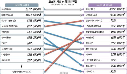 코스피 시총 상위주 판도 요동…한화에어로, 23계단 뛰어 5위로