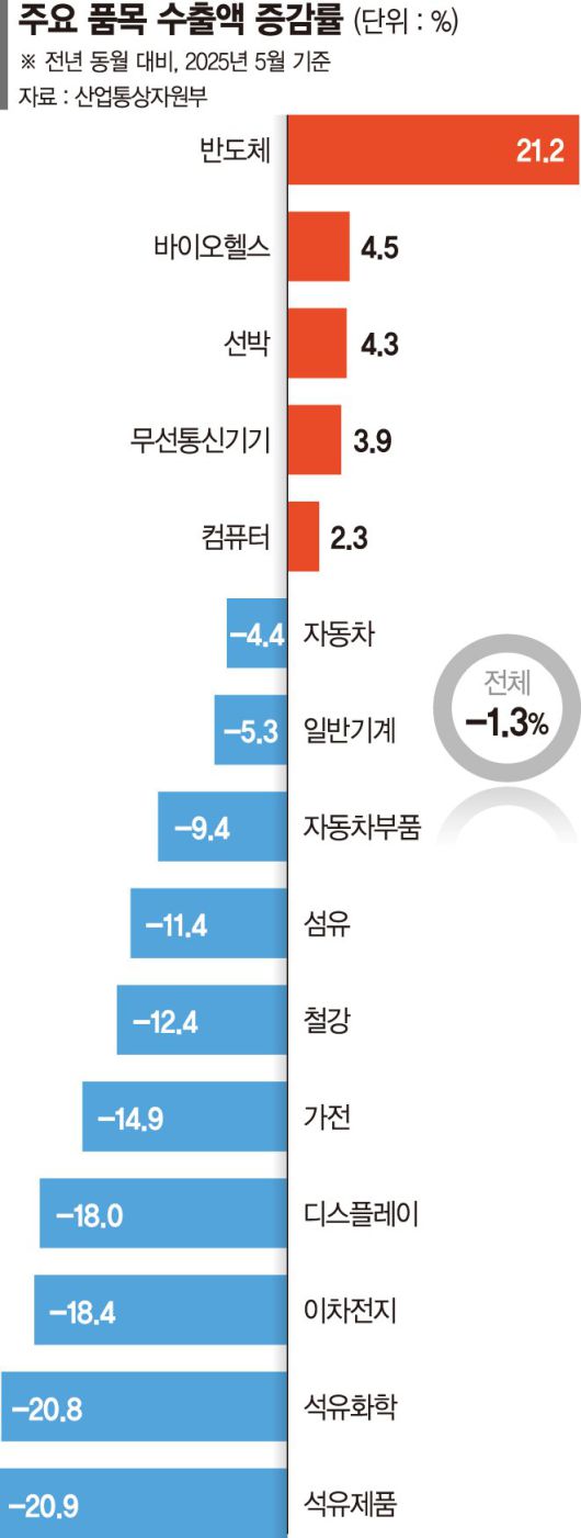 반도체·바이오헬스 '선전', 자동차·철강 '부진'. 5월 수출입 동향에서 나타난 주요 특징은 반도체의 선전 속에 자동차와 철강 등 일부 품목의 부진이다. 우리나라 수출 1위 품목인 반도체는 고대역폭메모리(HBM), 더블데이터레이트(DDR)5 등 고부가가치 메모리 반도체 수요가 견조하게 이어지며 역대 5월 중 가장 높은 실적을 기록했다. 반면 자동차와 철강은 미국 정부의 품목별 관세 부과 여파로 수출이 큰 폭으로 줄었다.