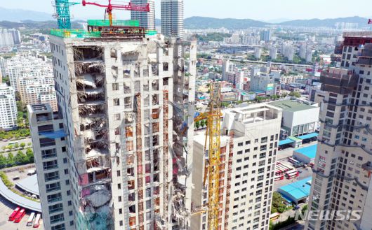 [광주=뉴시스] 류형근 기자 = 신축 건물 공사 중 상층부가 무너져 6명이 숨지고 1명이 다친 광주 화정아이파크 현장. 4일 오전 HDC현대산업개발은 붕괴 사고가 발생한 201동을 포함해 8개 동 전체를 전면 철거한 후 재시공하기로 결정했다. 2022.05.04. hgryu77@newsis.com |
