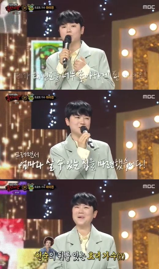 마이진은 "트로트 가수 활동한 지 15년이 됐는데 무명 생활이 길게 지속되다가 '현역가왕'에서 많은 사랑을 받았다. 통장이 조금 든든해지면서 엄마와 살 수 있는 집을 마련했다"고 근황을 전해 박수를 받았다.