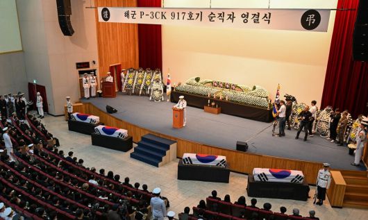 이날 경북 포항 해군항공사령부 강당에서는 초계기 추락 사고로 순직한 장병 4명의 합동영결식이 해군장으로 엄수됐다. 영결식을 주관한 양용모 해군참모총장은 순직한 장병 4명의 이름을 한명 한명 부르며 조사를 시작했다. “그대들의 숭고한 희생이 결코 헛되지 않도록 대한민국의 바다를 굳건히 지켜내고, 유가족을 우리 가족으로 생각하며 끝까지 보살피겠다”고 애도하던 그는 중간중간 말을 잇지 못했다. 동료 장병의 추도사가 낭독되고 유족의 헌화가 이뤄질 때는 영결식장이 울음소리에 휩싸이기도 했다. 사고기 승무원인 박진우 중령, 윤동규·강신원 상사는 이날 오후 국립대전현충원에 안장됐다. 이태훈 소령은 유족의 뜻에 따라 고인의 고향인 경북 경산과 가까운 영천호국원에 안장됐다.