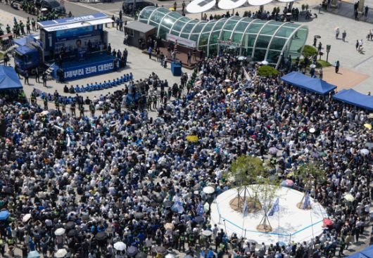 이재명 더불어민주당 대선 후보의 유세가 열린 1일 대구 동구 동대구역 광장에 시민들이 몰려 이 후보의 연설을 듣고 있다. 대구 뉴스1 |