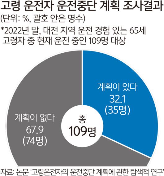 1일 학회지 장기요양연구에 실린 ‘고령 운전자의 운전중단 계획에 관한 탐색적 연구’ 보고서에 따르면 2022년 말 대전에서 운전 경험이 있는 65세 이상 고령자 184명을 조사한 결과 59.2%에 해당하는 109명이 ‘현재 운전 중’이라고 답했다. 이들 109명의 평균 연령은 74.9세로, 대부분 남성(82.6%)이었으며 독거노인은 17.4%였다.