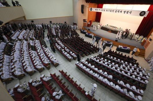 1일 경북 포항시 해군 항공사령부 강당에서 '해군 P-3CK 917호기 순직자 영결식'이 엄수되고 있다. [사진=연합뉴스] |