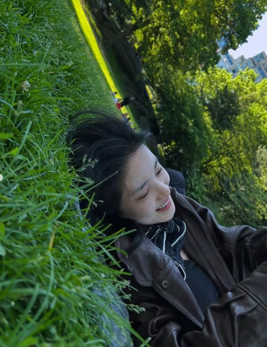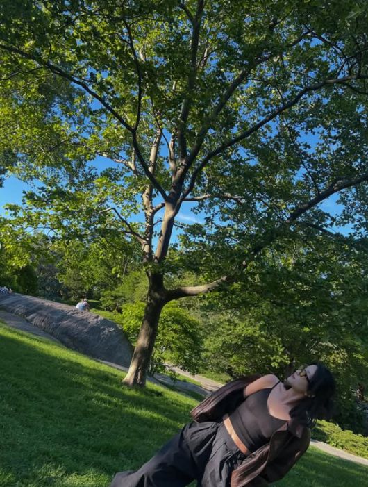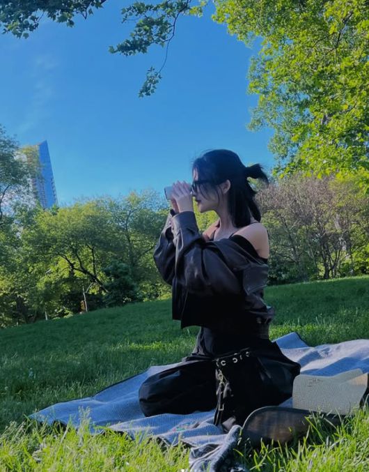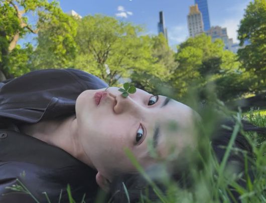 공개된 사진 속 김태리는 푸른 잔디와 나무가 어우러진 도심 공원에서 여유로운 시간을 보내고 있다. 김태리는 블랙 컬러의 오프숄더 상의와 와이드 팬츠, 가죽 재킷 등 세련된 올블랙 스타일링으로 시크한 매력을 드러냈다. 잔디에 누워 네잎클러버를 입에 물고 하늘을 바라보는 등 자연을 만끽하는 모습이 인상적이다. 배경에는 초록빛 나무와 파란 하늘, 그리고 고층 빌딩이 어우러져 도심 속 자연의 여유로움을 느끼게 한다.