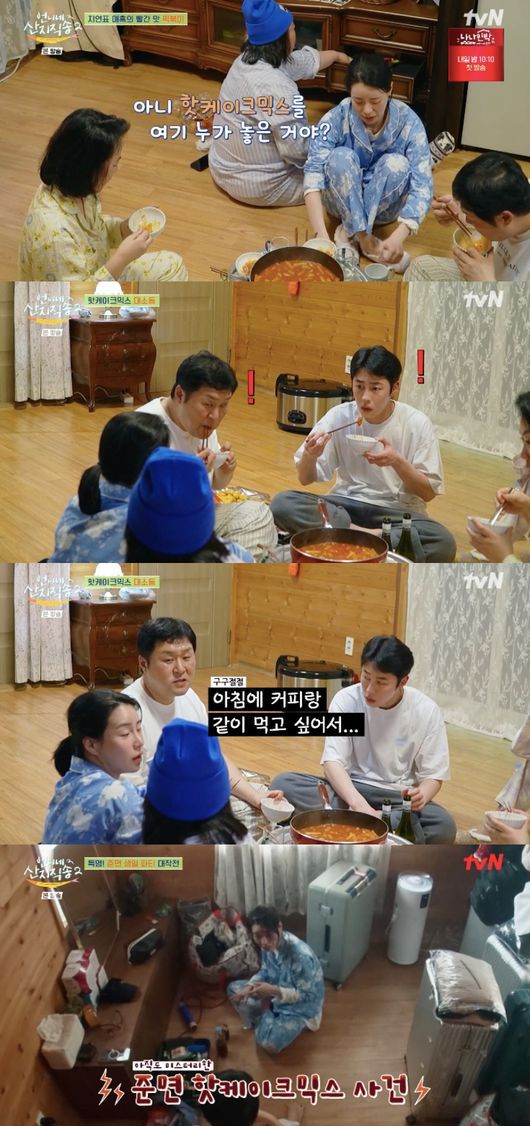 이날 야식으로 임지연표 떡볶이를 먹던 중 박준면은 땀 흘리는 이재욱을 위해 티슈를 건넸다. 이어 물티슈를 찾던 중 서랍장에서 핫케이크믹스 가루를 발견했고, 그는 “아니 핫케이크믹스를 왜 여기에 누가 넣은 거냐”라고 물었다.