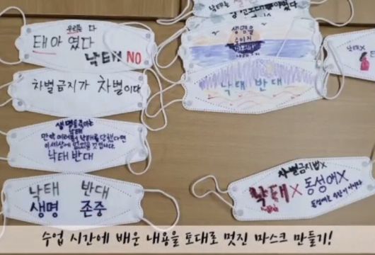 수업에서는 차별금지법과 임신중지를 반대하는 주장도 ‘교육’됐고 학생들은 이런 내용으로 편지를 쓰기도 했다. 학생들은 마스크에 ‘차별금지법 반대’ 등의 문구를 적었고 미혼모들을 향한 편지에 “낙태를 하지 않은 것만으로도 잘했다”고 썼다. 강사로 참여했던 양씨는 수업을 마친 뒤 “하나님이 우리에게 주신 꿈을 통해 어떻게 낙태와 동성애 등 아파가는 세상을 회복할 수 있는지 나눴다”고 말했다.