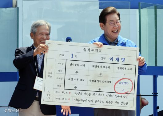 초등학교 은사에게 ‘대선 후보 올 수 성적표’ 받고 활짝 이재명 더불어민주당 대선 후보가 1일 경북 안동시 웅부공원에서 열린 유세에서 초등학교 은사인 박병기 교사로부터 성적표를 받고 있다. 박민규 선임기자