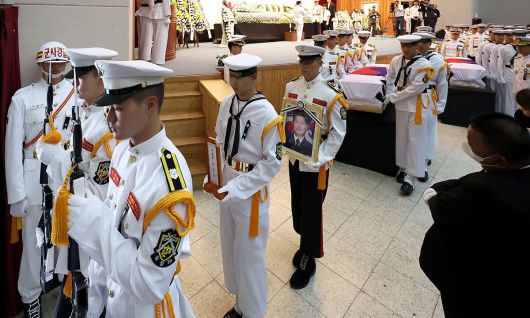 해군 초계기 추락 사고로 순직한 장병 4명의 합동 영결식이 열린 1일 오전 경북 포항시 해군 항공사령부 경연관. 순직 장병은 정조종사 박진우 중령(해사 68기, 이하 추서 진급된 계급), 부조종사 이태훈 소령(해사 73기), 전술사 윤동규 상사(부사관 260기), 전술사 강신원 상사(부사관 269기)다. 해군장(葬)으로 엄수된 이날 영결식에서 고 강 상사의 어머니가 관을 부여잡고 “엄마를 왜 두고 가느냐”며 통곡하자 영결식장은 순식간에 울음바다로 변했다. 박 중령의 세 살배기 아들은 아버지 관 앞에서 장난감을 갖고 해맑게 놀다가 어렴풋이 아버지의 영원한 부재를 느끼게 된 이후에는 울음을 그치지 않아 참석자들을 먹먹하게 만들었다.